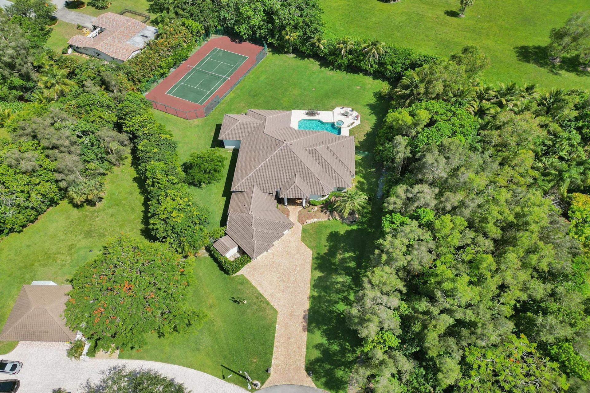 A private resort-style estate in Plantation Acres, set on 49,077 sq ft in a quiet cul-de-sac. This exceptional home offers 5 bedrooms plus office, 5.5 baths, and a split floor plan designed for both comfort and entertaining. Architectural details include dome ceilings, custom curves, columns, and built-ins throughout. Enjoy a chef's kitchen, wet bar, private theater for 12, sauna, and new A/C in the primary suite and office. Outdoors, experience a North/South tennis court, resort-style pool and ...A private resort-style estate in Plantation Acres, set on 49,077 sq ft in a quiet cul-de-sac. This exceptional home offers 5 bedrooms plus office, 5.5 baths, and a split floor plan designed for both comfort and entertaining. Architectural details include dome ceilings, custom curves, columns, and built-ins throughout. Enjoy a chef's kitchen, wet bar, private theater for 12, sauna, and new A/C in the primary suite and office. Outdoors, experience a North/South tennis court, resort-style pool and spa, outdoor shower, and patio with built-in BBQ and refrigerator. Complete with newer roof, hurricane shutters, ample parking, and lush private grounds-this is a rare lifestyle estate.