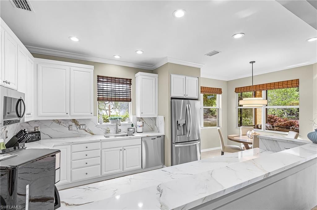 There is nothing else like this view in Vasari. Wrap-around water stretches in every direction-a serene lake with fountains giving way to a lush preserve backdrop and the newly renovated championship golf course beyond. At sunrise and sunset, rainbows shimmer through the fountain mist. Herons wade the shoreline. Butterflies drift in from the garden across the lake. And with no neighboring roofline or building in your sightline, the privacy is absolute-this is the rare home where the blinds stay ...There is nothing else like this view in Vasari. Wrap-around water stretches in every direction-a serene lake with fountains giving way to a lush preserve backdrop and the newly renovated championship golf course beyond. At sunrise and sunset, rainbows shimmer through the fountain mist. Herons wade the shoreline. Butterflies drift in from the garden across the lake. And with no neighboring roofline or building in your sightline, the privacy is absolute-this is the rare home where the blinds stay open day and night. Step inside this beautifully updated first-floor end unit home and that panoramic setting follows you everywhere. The expansive great room, finished with crown molding and large-format diagonal tile, opens through pocket sliders to a generous screened lanai with room for both lounge seating and alfresco dining beneath a tropical palm-leaf fan. Southeast and southwest exposures flood the interior with natural light from morning through evening. The freshly remodeled U-shaped kitchen (2026) features crisp white cabinetry, quartz countertops with a coordinating full-height backsplash, new sink, and stainless steel appliances including a wall oven and French-door refrigerator. The adjoining breakfast nook, framed by corner windows and a drum pendant, is the perfect spot for morning coffee while watching the water. A split-bedroom floor plan ensures true privacy. The primary suite offers plantation shutters, dual walk-in closets, and a spa-inspired bathroom completely renovated in 2026-highlighted by rare Cristallo quartzite countertops, split vanity areas, a corner soaking tub, and a frameless glass walk-in shower with teak bench and grab bars. The den showcases rich hardwood flooring and plantation shutters, ideal as a home office, media room, or guest space. Over $40,000 in thoughtful updates extend throughout: all-new ceiling fans with remotes (2026), LED recessed lighting (2026), new bathroom exhaust fans, comfort-height toilets, and a new Electrolux washer and dryer (2025). A newer hot water heater and automatic garage door opener add peace of mind. The roof was replaced in 2020, and a fresh exterior paint scheme is expected by June 2026 (see last two photos). Offered furnished with immediate golf membership included and the clubhouse renovation assessment (Renaissance Project) paid in full-a significant savings not every unit can offer. Steps from your door, the gated Toscana pool and heated spa, outdoor grills, community mailboxes, and guest parking sit directly across the street. Vasari's resort-caliber amenities include 18 holes of championship golf (renovated 2025), lighted tennis and bocce courts, pickleball (arriving 2026), a fitness center, and a renovated clubhouse with dining and outdoor terrace. 20-30 minutes from 5th Avenue Naples, Coconut Point, Mercato, the Gulf beaches, and RSW-all without I-75 or US-41.