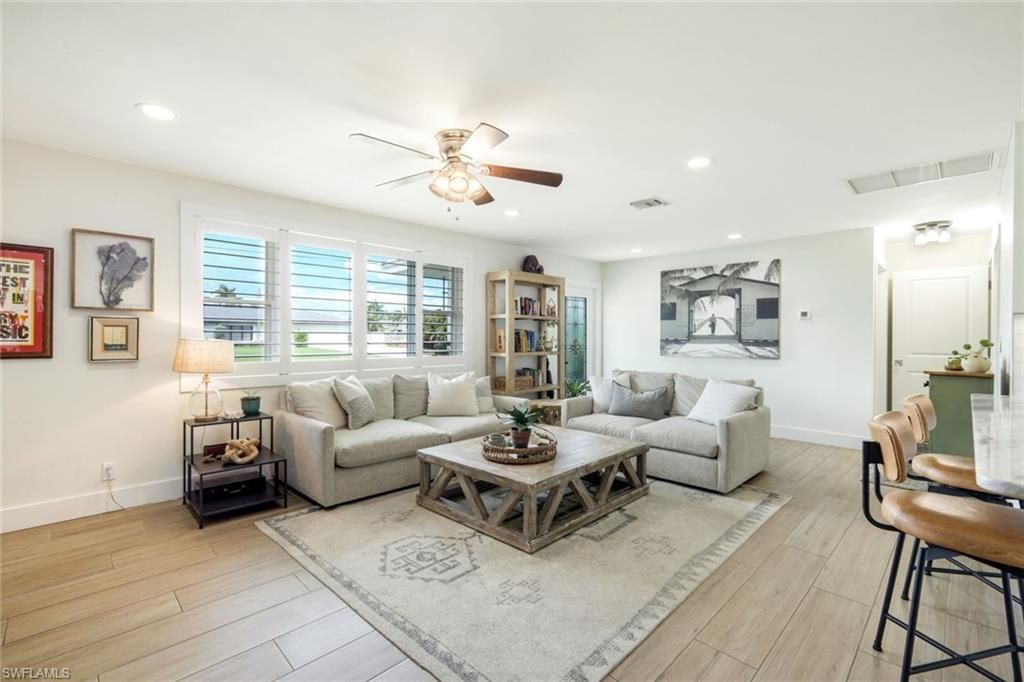 Completely renovated and move-in ready, this exceptional home offers a like-new feel with high-end finishes and extensive upgrades throughout. The interior features new wood-look tile flooring, quartz countertops throughout, a fully remodeled kitchen with stainless steel appliances, cooktop, double oven, and a bar area, along with a dry bar complete with wine cooler. Additional enhancements include updated bathrooms, recessed lighting, designer light fixtures, shiplap accent walls, plantation sh...Completely renovated and move-in ready, this exceptional home offers a like-new feel with high-end finishes and extensive upgrades throughout. The interior features new wood-look tile flooring, quartz countertops throughout, a fully remodeled kitchen with stainless steel appliances, cooktop, double oven, and a bar area, along with a dry bar complete with wine cooler. Additional enhancements include updated bathrooms, recessed lighting, designer light fixtures, shiplap accent walls, plantation shutters, and a spacious laundry room with sink and abundant cabinetry, garage has its own A/C unit. Charming wooden storage shed with a durable metal roof, thoughtfully attached to the right side of the home—offering convenient and attractive additional storage space. Garage A new metal roof and a new well system installed in 2025 provide added value and peace of mind. Situated on a private lot backing to a preserve area, the property offers a tranquil setting with no rear neighbors. The expansive, fully fenced backyard, along with an open lanai and deck, creates the perfect space for outdoor living and entertaining. Residents enjoy access to a community park featuring picnic areas and play spaces, as well as optional membership to a private boat dock with direct access to Estero Bay. Ideally located just minutes from Coconut Point Mall, dining, and everyday conveniences, this hidden gem offers both privacy and close proximity to everything Southwest Florida has to offer. Seller recently cleared portions of the easement area, improving the perceived backyard space; sod installation is needed. Buyers to verify permitted uses and any restrictions.