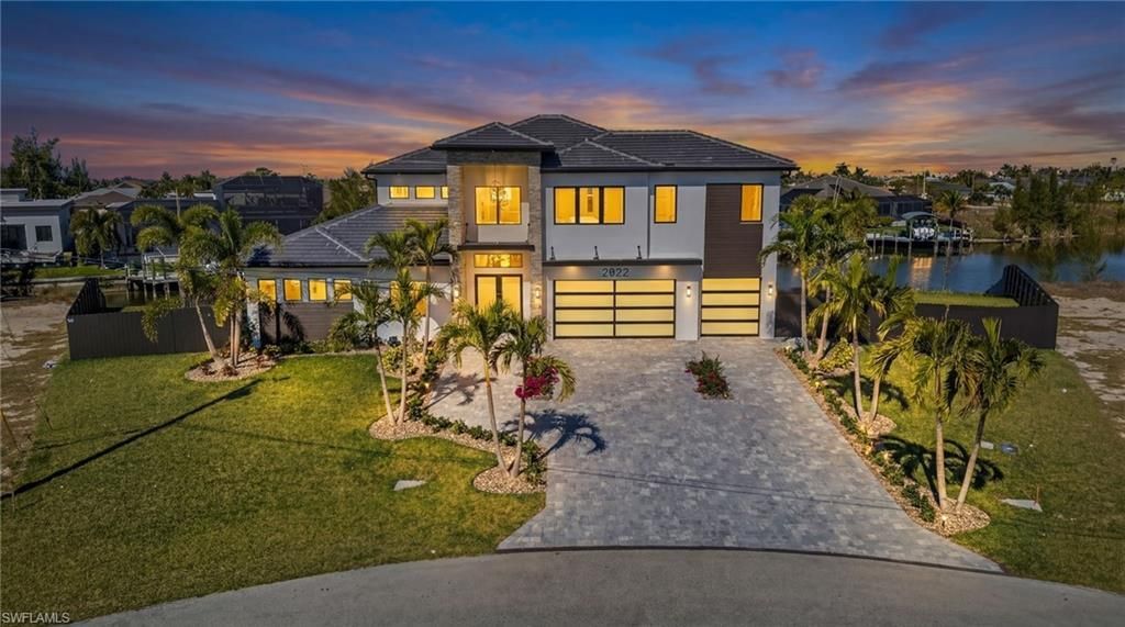 Presenting a brand-new construction, two-story masterpiece on a premier Gulf-access oversized lot (.43 acres) located in Flood Zone X (no lender-mandated insurance required). Boasting 5 bedrooms and 3.5 bathrooms, this home offers unmatched curb appeal and a one-of-a-kind design for SW Cape Coral. The primary suite is conveniently located on the main level with sliders opening directly to the lanai. The main level also provides a centrally located half-bath and a versatile second bedroom perfect...Presenting a brand-new construction, two-story masterpiece on a premier Gulf-access oversized lot (.43 acres) located in Flood Zone X (no lender-mandated insurance required). Boasting 5 bedrooms and 3.5 bathrooms, this home offers unmatched curb appeal and a one-of-a-kind design for SW Cape Coral. The primary suite is conveniently located on the main level with sliders opening directly to the lanai. The main level also provides a centrally located half-bath and a versatile second bedroom perfect for a home office or den. The kitchen is a showstopper, featuring an eat-in island, large dining space, a walk-in pantry, and a stunning view of the pool and canal. You will appreciate the abundance of natural light illuminating the soaring 21-foot ceilings and open-concept living area on your main level.Upstairs, a spacious loft includes a wet bar and sitting area-the perfect spot for a media nook or reading retreat-plus 3 guest bedrooms and 2 full bathrooms. This property is uniquely situated at the intersection of the Shaugnessey and Progress Canals, providing wide-water views and Gulf access for boating enthusiasts. A standout feature is the Northwest rear exposure, which provides premier, unobstructed sunset views year-round. This property provides significant green space, offering versatility for a custom garden or a private play area. This residence presents a rare combination of prime canal-front positioning, exceptional exposure, and a large, usable lot. The curb appeal on this home is just outstanding, see it for yourself!(Several images are virutally staged)